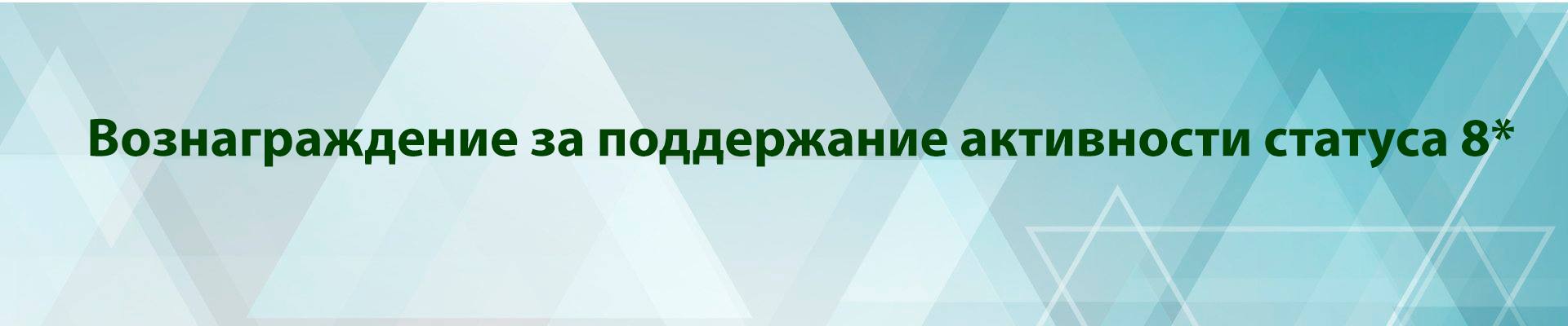 Участники: дистрибьюторы, получившие статус 8* до начала периода аттестации (до 30.12.2022) за исключением дистрибьюторов с почетными статусами. Условия: 1) Накопительный объем структуры за период аттестации ≥25000 PV. 2) Накопительный боковой объем за период аттестации ≥18000 PV. 3) Накопительный личный объем за период аттестации ≥1200 PV. Вознаграждение: денежное вознаграждение 1000PV |
