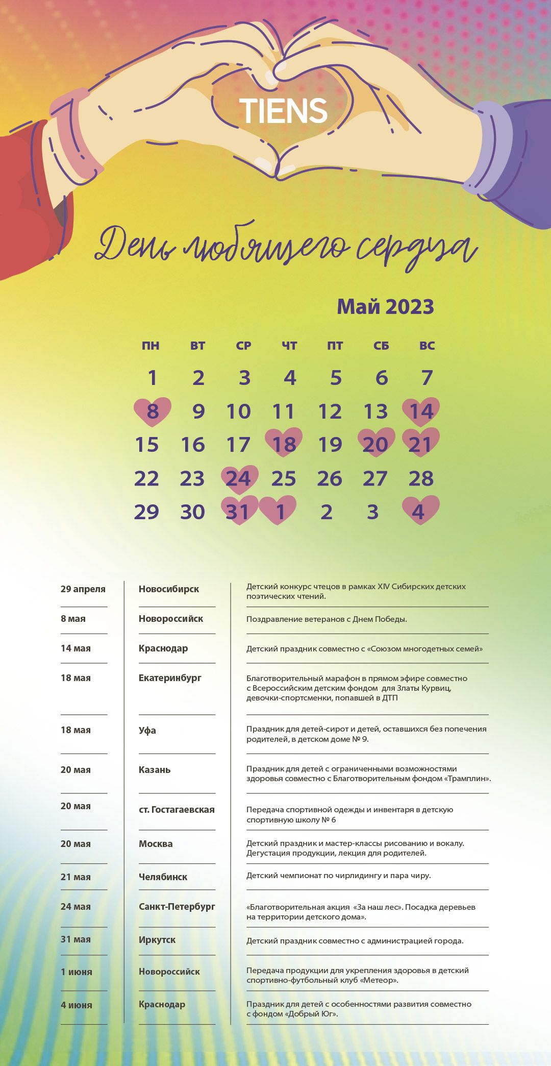 День Любящего Сердца – это международная акция, который в Tiens group традиционно проходит 18 мая. Впервые этот праздник состоялся 18 мая 2006 года, и с тех пор ежегодно в мае месяце дистрибьюторы и сотрудники Компании устраивают благотворительные акции, проходящие под девизом «Чувствовать любовь, создавать любовь, передавать любовь».